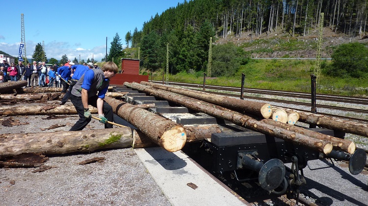 Eine Gruppe Schweizer Enthusiasten zeigte das Verladen von Baumstämmen.