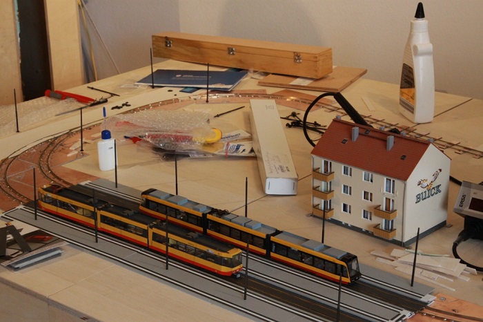 Daniel Hübners H0-Tramanlage, das „Karlsruher Modell“ simulierend, wurde von den Freunden der Modellgruppe Südwest aus München