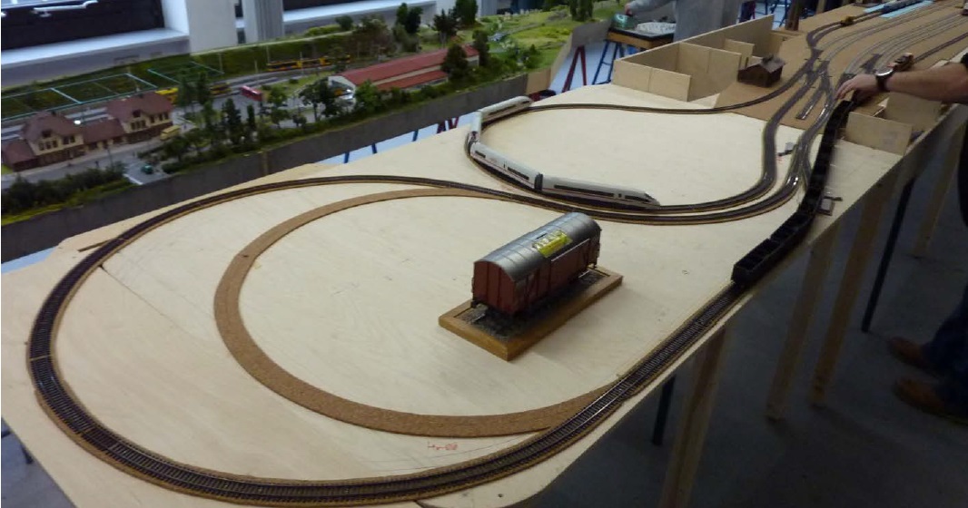 Mit unseren am Ende offenen Segmenten lassen sich die Weichenstraßen naturgemäß nur unvollständig befahren. Daher kam die Idee auf, die vorhandenen Bahnhofssegmente durch provisorische Kehrschleifen auf beiden Seiten zu ergänzen, damit der Bahnhof auch im richtigen Fahrbetrieb getestet werden kann. Nach kurzer Planungsphase wurden zwei Multiplexplatten und einige Holzrahmenzuschnitte bei unserem erprobten Holzlieferanten, der Firma Holz-Hirsch in Rheinstetten, bestellt, geliefert und zusammen gebaut.