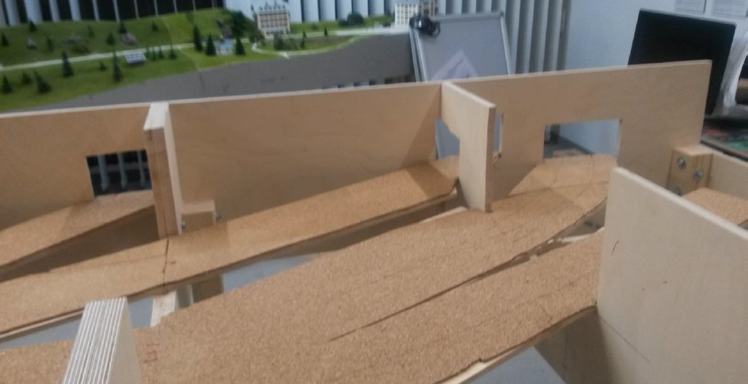 Nach dem ersten Zuschneiden der Spanten konnten dann die Trassenbretter aufgebracht werden. Unter den Gleisen liegt eine Schicht mit 3-mm-Kork.